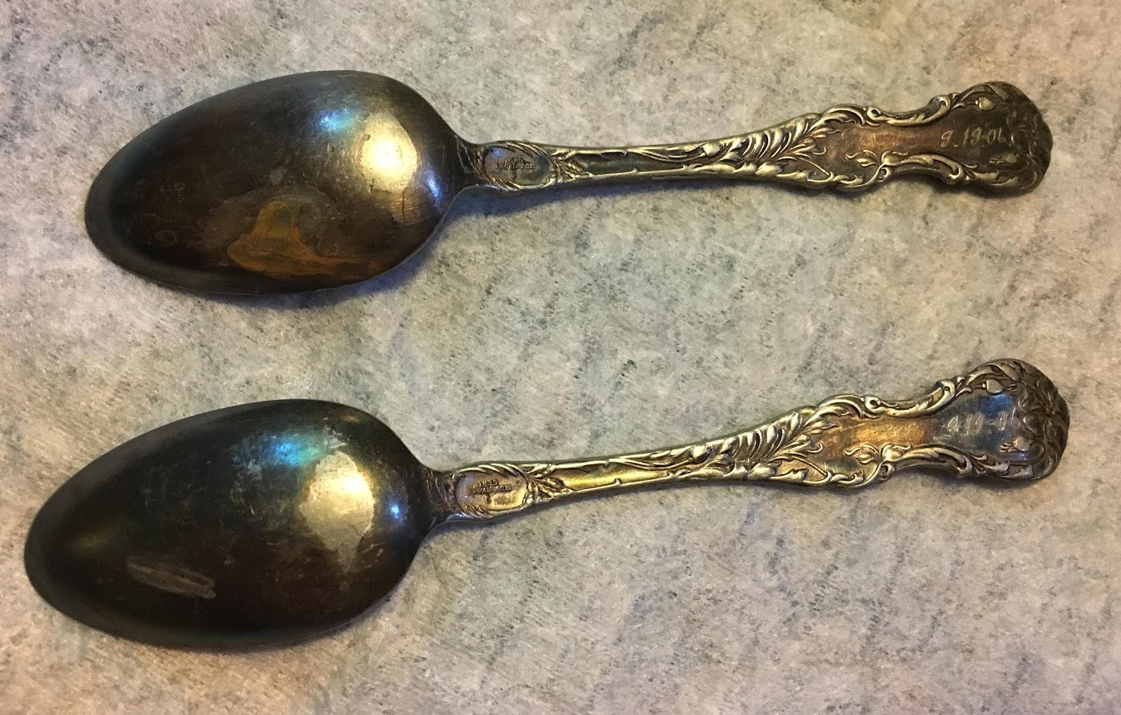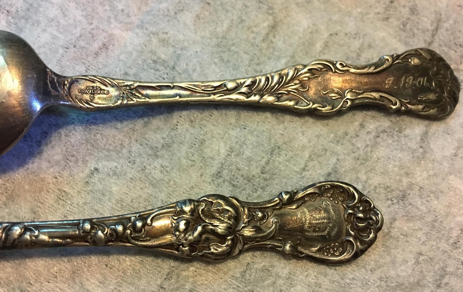 When we were sorting through everything, we spotted the monogrammed H on a pair of tarnished spoons and set them aside in case the H stood for Harmon. The spoons had a date engraved on them, which we figured would help us decipher their history.