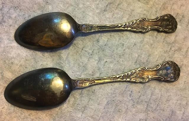 Since then, as I've been working through the family archived and genealogy, I've become familiar with the significant dates in the Harmon family tree. When I looked again at the spoons last weekend, I immediately knew what they were.
